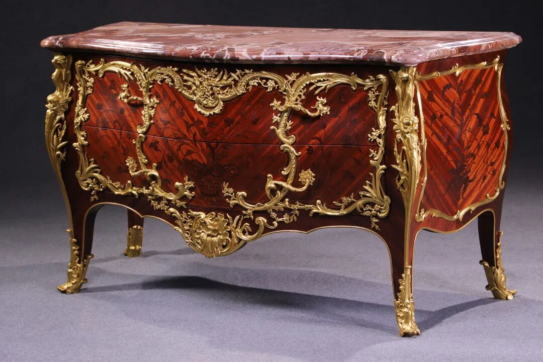 材质:胡桃木及细木镶嵌,精美鎏金铜配饰