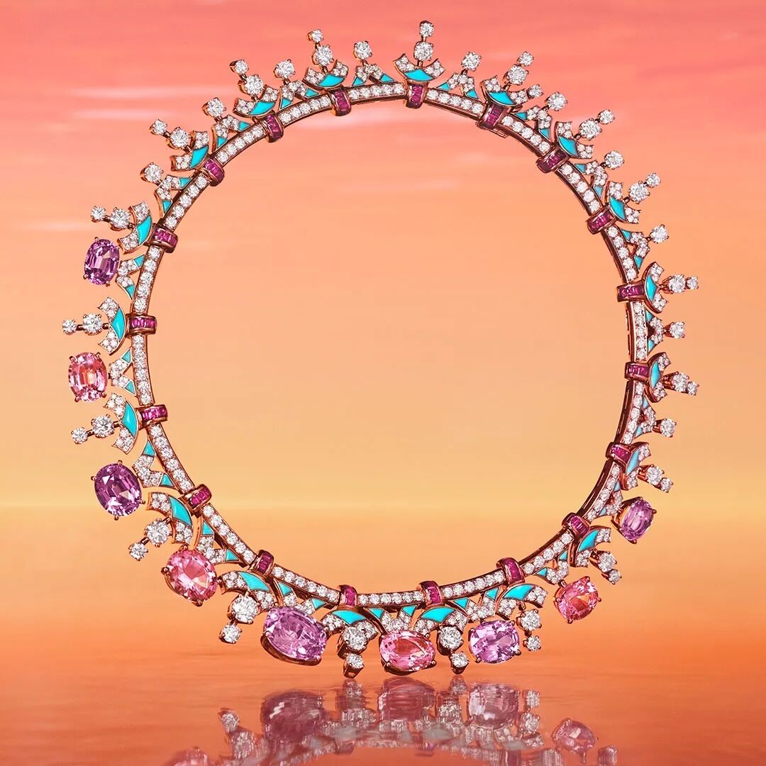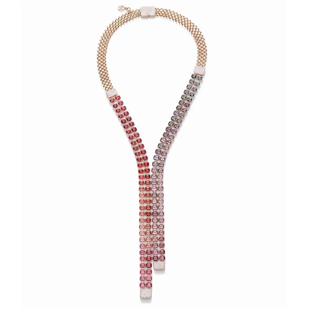 “Vertical Landscapes”主题运用几何线条和宝石色彩演绎米兰现代建筑之美。设计师从“维拉斯加塔楼”(Torre Velasca)等标志性建筑中汲取灵感,一件“Skyline”玫瑰金项链采用非对称设计,镶嵌128颗稀有枕形彩色尖晶石,从红色自然渐变至绯红、暗粉、淡紫、天蓝和烟灰色调,如同米兰的落日余晖在摩天高楼映衬出的梦幻光影。