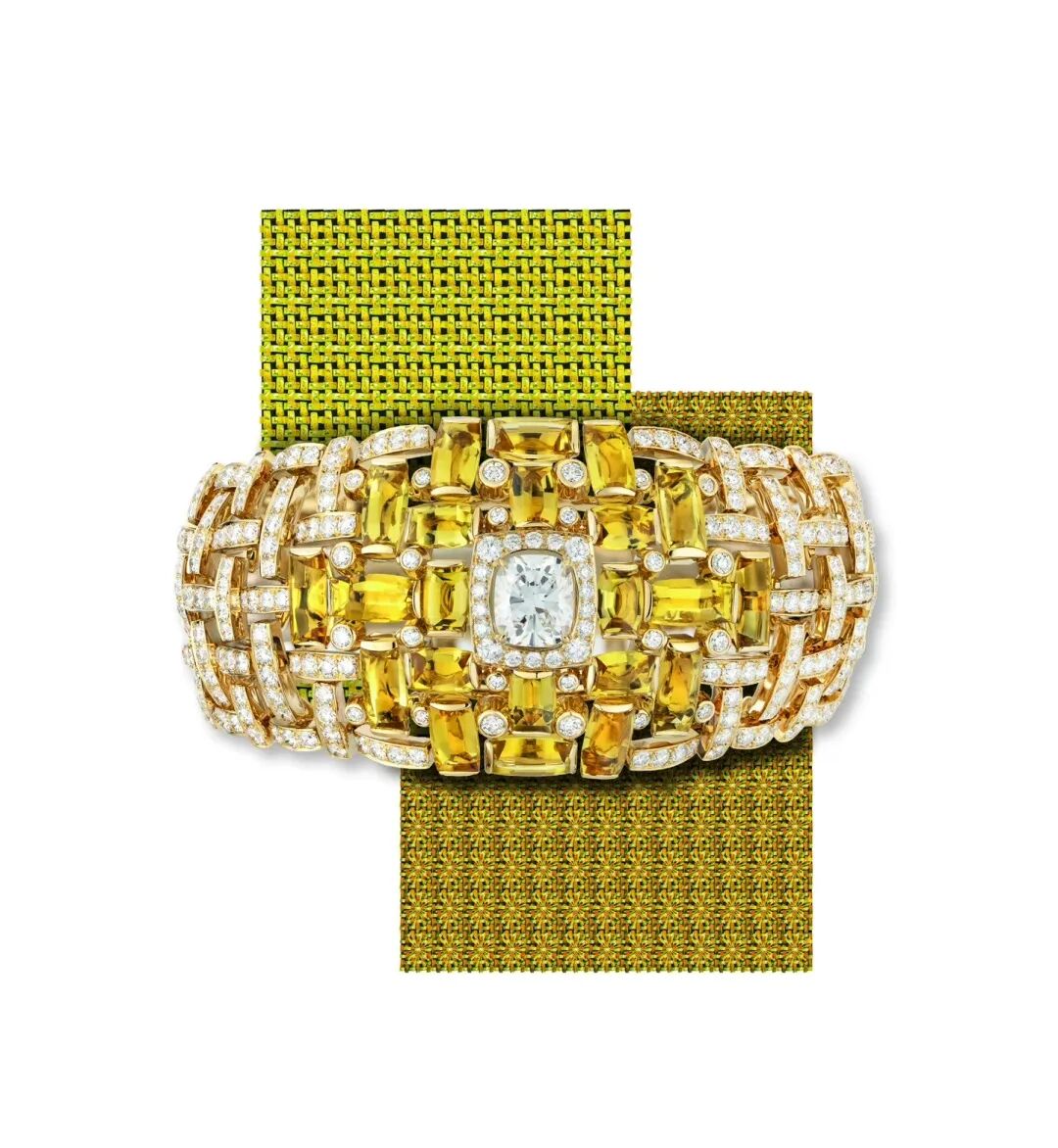 “Glitter Fever”主题中首次采用传统珠宝工艺中的雪花式镶嵌工艺,以15颗枕形黄钻与无色钻石铺镶梯形链节,呈现极富几何美感的外形轮廓,以此致敬狂欢派对上的华丽装扮。