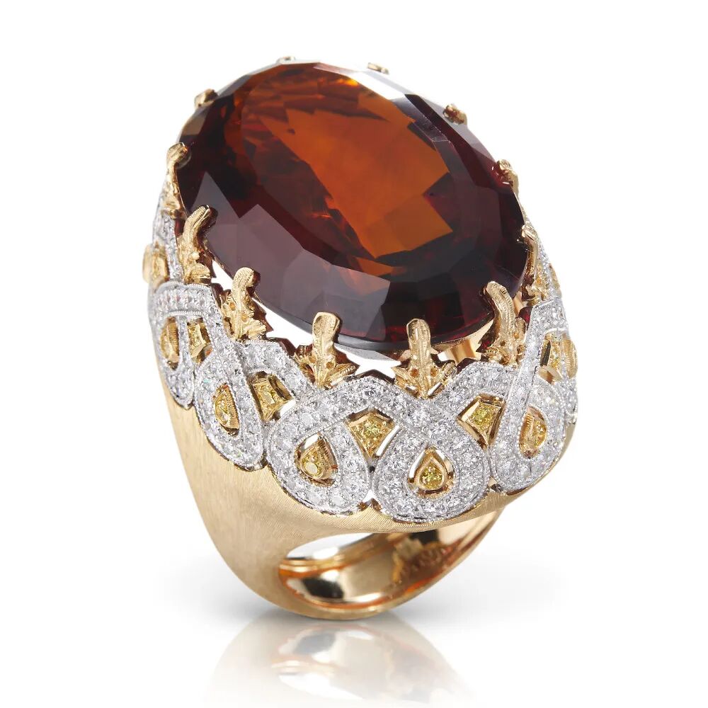 极具色彩张力的是一组鸡尾酒戒指,中央镶嵌大颗粒彩色宝石成为醒目焦点。戒指的戒壁运用Rigato手工拉丝工艺呈现细腻刻纹,戒托为连贯的白金波浪纹路,黄钻和无色钻石营造出视觉层次。亮点是镶爪金雕成叶片造型,托起一颗重达32.02c克拉椭圆形切割黄水晶主石,让人联想到拜占庭建筑的圆形穹顶。