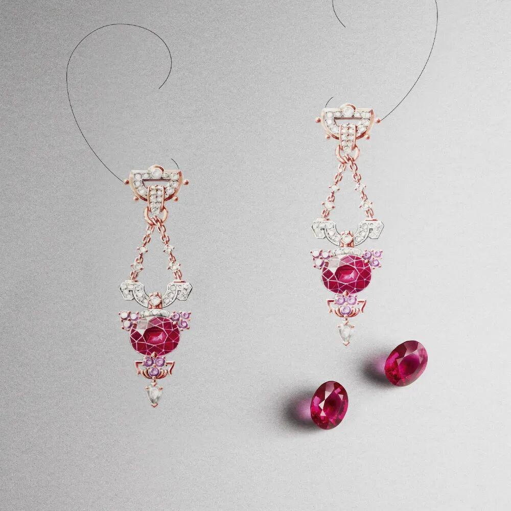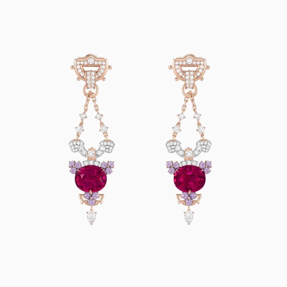 以“法国巴黎”为灵感演化而来的“Lucendi”耳环利用白金和玫瑰金的色彩碰撞塑造出18世纪法国吊灯的精致轮廓,璀璨钻石轻盈点缀椭圆形切割的红色碧玺,饱和的深红色调结合几何图案和利落的线条,让人联想到古典仕女身披华服的动人画面。