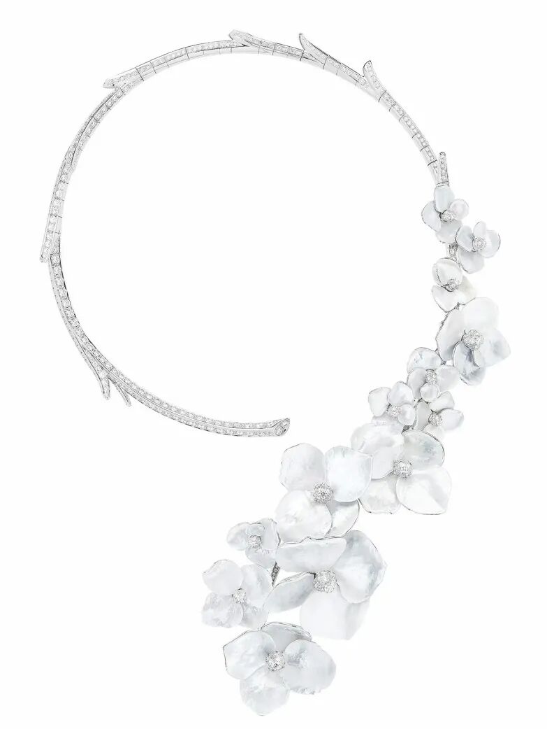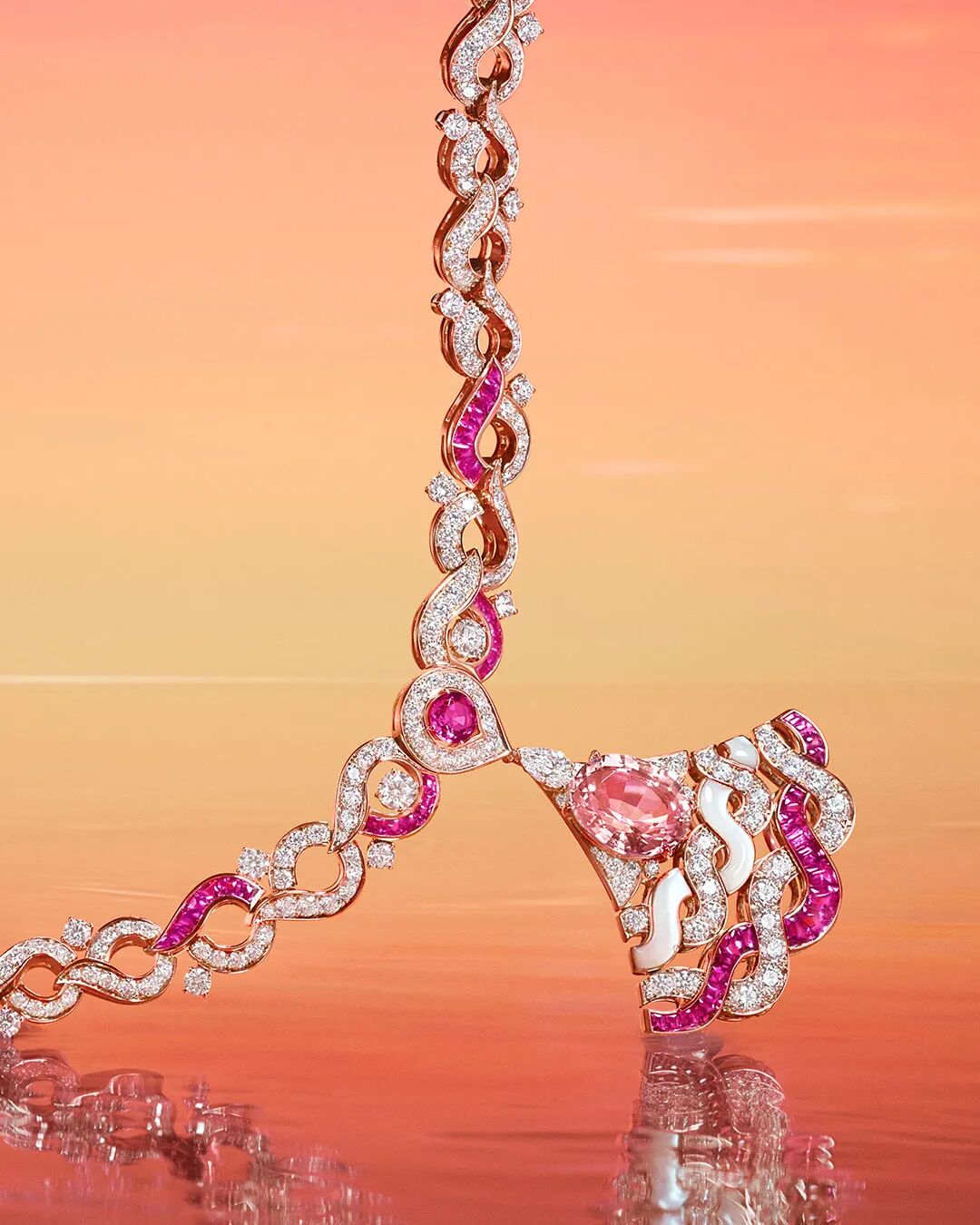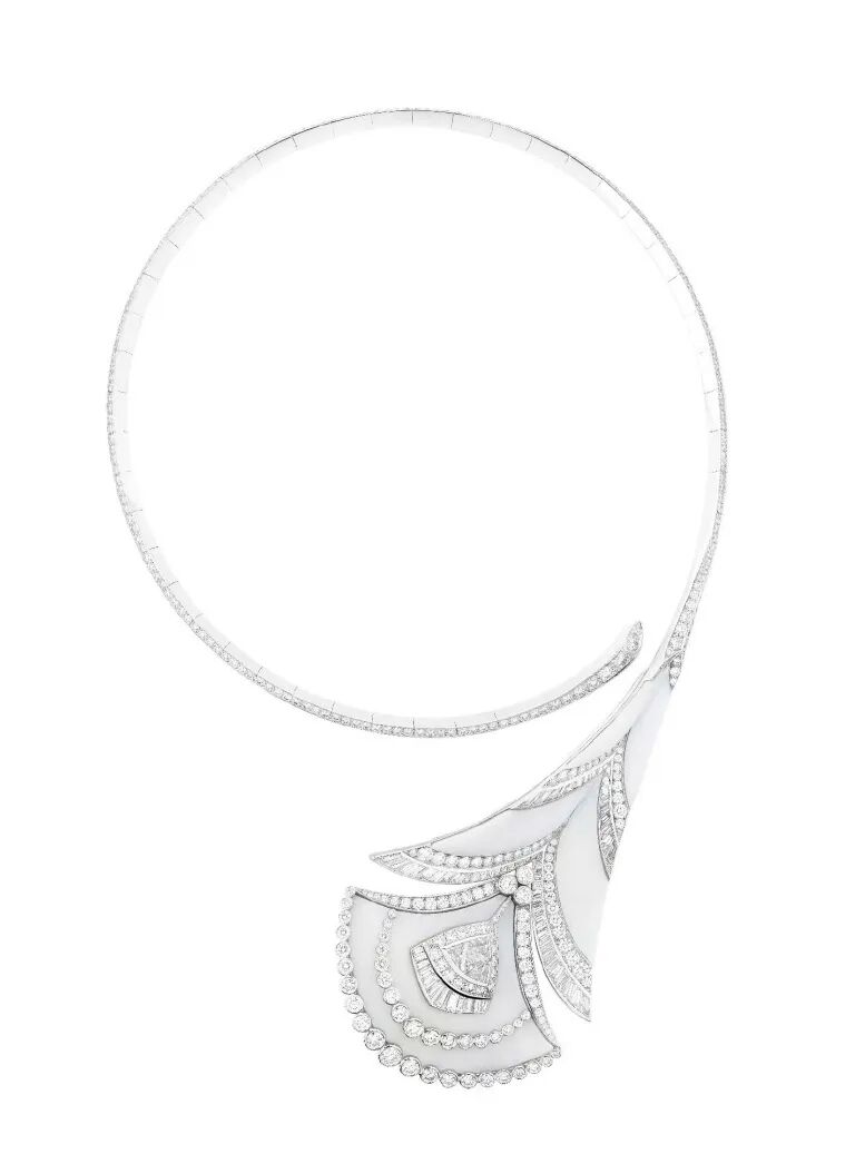 同样引人注目的一件是“Dreamweaver Diva's Dream”玫瑰金项链,运用珍珠母贝、钻石和红碧玺交织成绳索状纹理,构成轻盈镂空的经典扇形图案,让人联想到荡漾在地中海的波浪,明亮柔和的粉色光芒犹如晚霞抚弄着粼粼的波光。