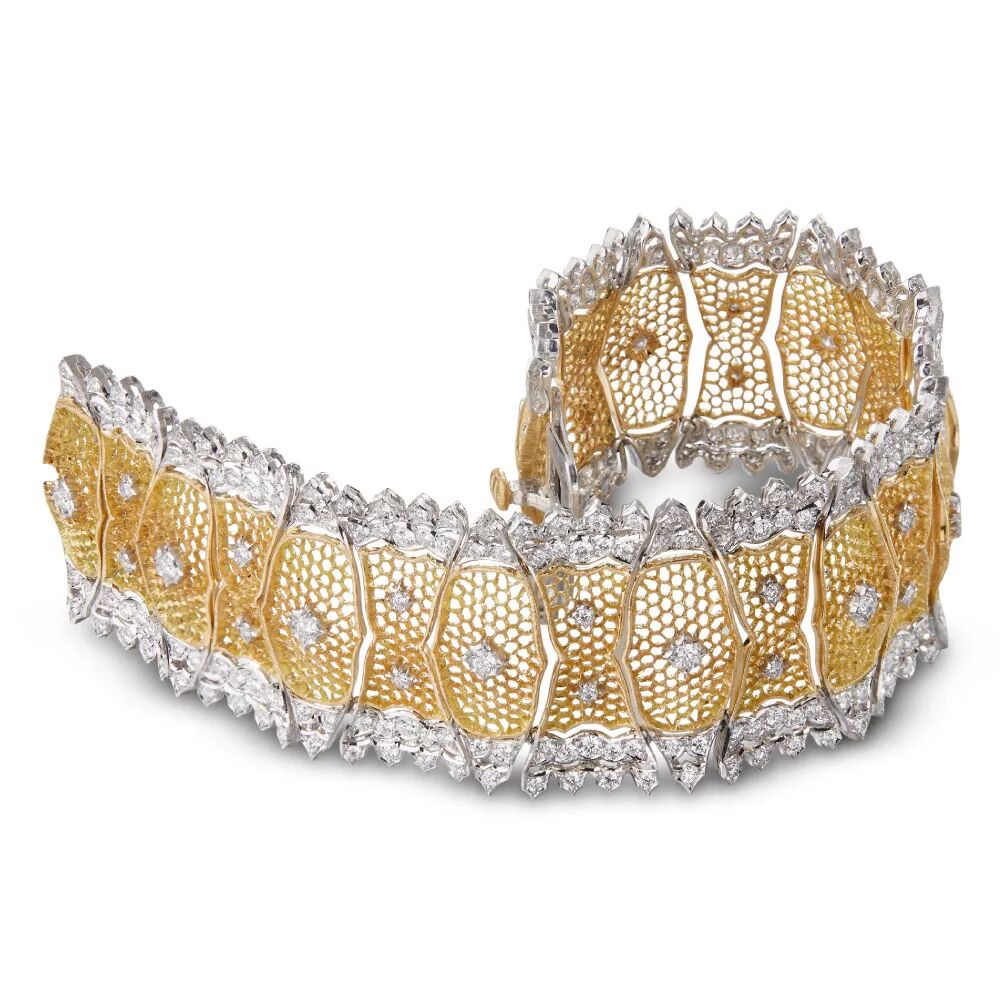 布契拉提是擅长重新诠释这一魔法技艺的。例如手镯运用Tulle珠罗纱工艺镂刻出蜂巢状花纹;戒指运用Rigato金雕拉丝工艺赋予戒壁丝缎般的细纹;以及交替运用黄金和白金塑造出同心四瓣花、叶瓣、螺纹等繁复花纹,标志性的黄金工艺皆被塑造出丰富的马赛克琉璃砖饰图案。