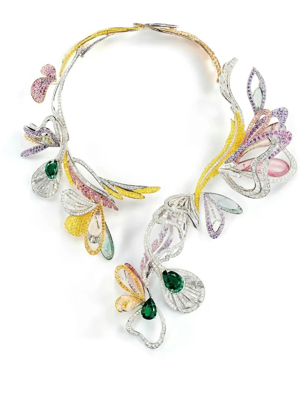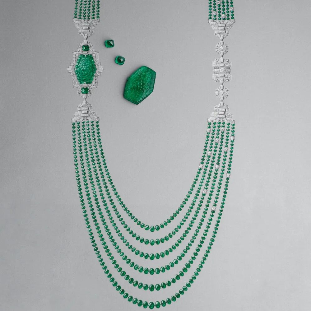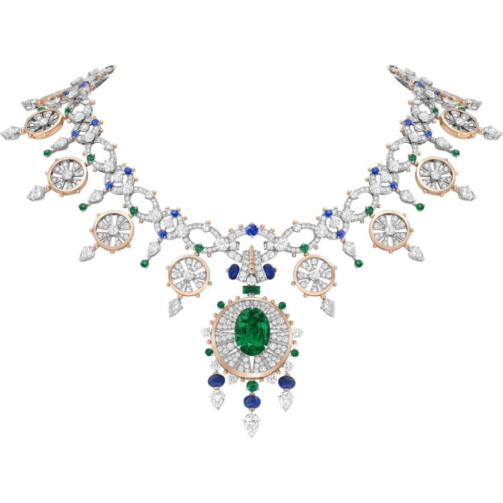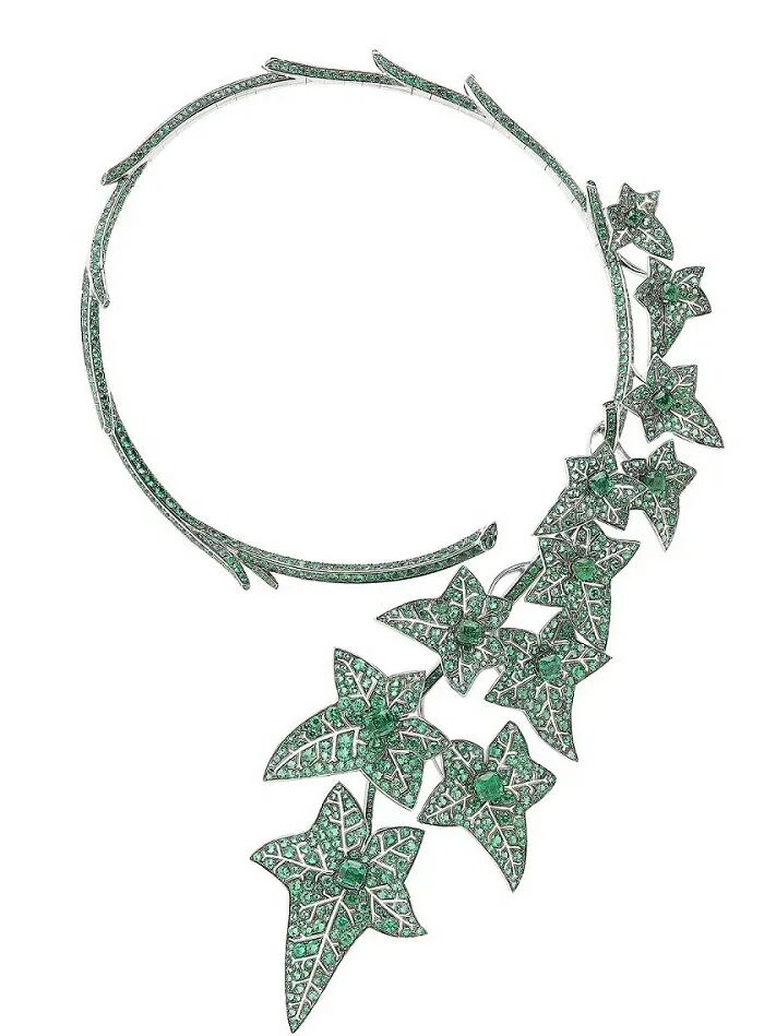 “Regina montium”白金项链则再现俄国小说家列夫·托尔斯泰的短篇小说《卢塞恩》中主人公于瑞士瑞吉峰(Mont Rigi)俯瞰卢塞恩湖的场景。而灵感拂过意大利古城,“Jardin de mosaïque”长项链则还原着意大利古城的古罗马艺术特色,一颗56.97克拉的六边形切割哥伦比亚祖母绿雕刻异常精美的花卉图案,呈现古罗马时期古典又华贵的结构之美。