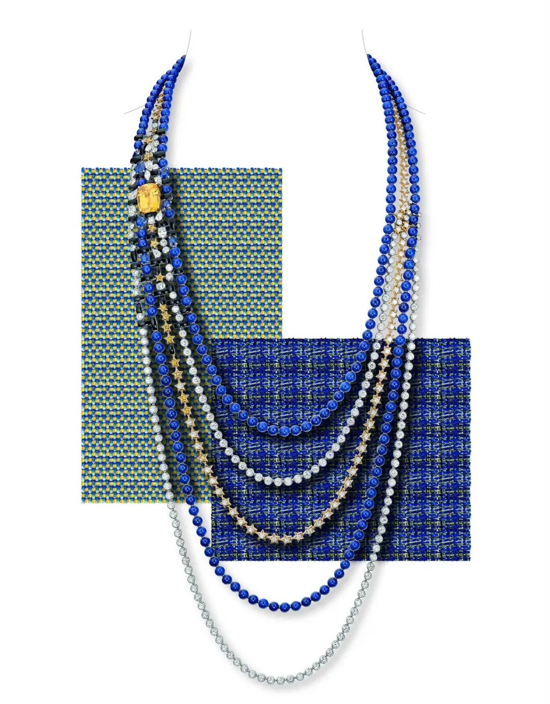 “Tweed Étoile”项链则将织物结构和彗星元素融合,运用蓝宝石、青金石和缟玛瑙描绘深邃夜空,黄色蓝宝石主石宛如耀眼的彗星,黄钻和无色钻石星芒营造出星河璀璨的夜幕图景。“Tweed Soleil”系列以太阳为灵感主题,甄选黄色系宝石表达阳光的色彩。这一系列中的Tweed Byzance黄金手镯以黄色绿柱石呈现明亮的金色调,钻石的璀璨也为主题增添更多熠熠光辉。