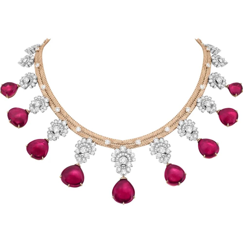 “Villanova”项链的创作灵感源自伊特鲁里亚(Etruscan)珠宝风格,演绎佛罗伦萨珍宝美学之源。水滴形艳红色碧玺垂悬于玫瑰金编织而成的链条之下,钻石镶嵌成花形,与红色的火彩互相争辉,再现伊特鲁里亚雕像的头冠轮廓。