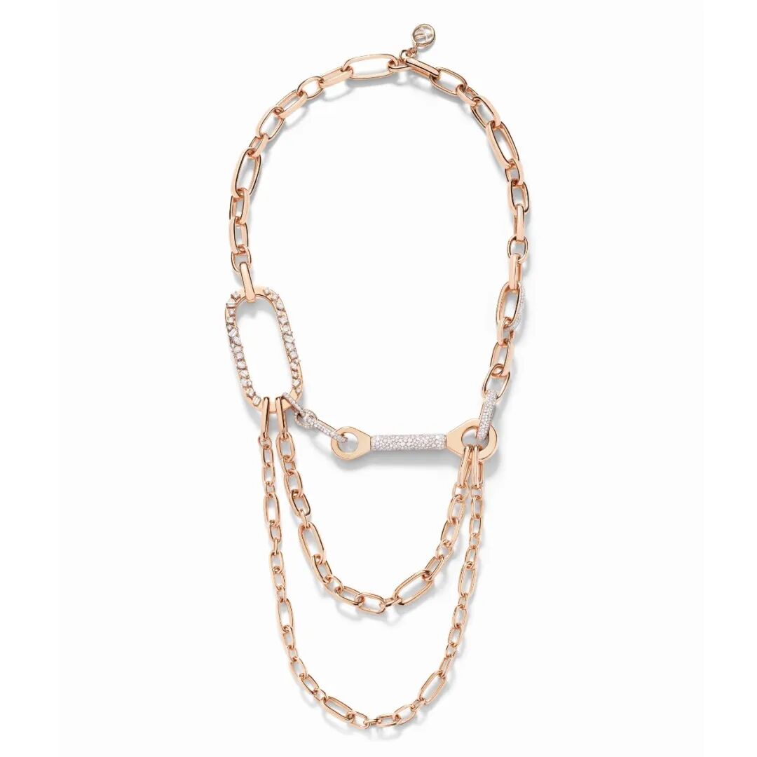 “Piazza divina”项链引人想象漫步于古罗马城门和圣彼得广场(San Pietro Piazza)。这座“永恒之城”以华丽的巴洛克建筑而闻名于世,满载贝尼尼(Bernini)的奇思妙想:梯形的建筑竟可与椭圆形的空间布局并存共融。这串项链以连绵舒展的直线和圆润弧线,含蓄地呼应大师的几何美学。