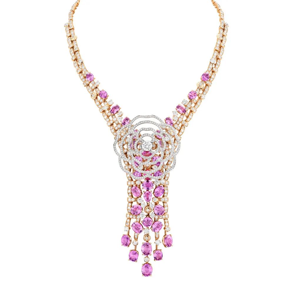 “Tweed CAMÉLIA”项链以甜美浪漫的粉色系烘托山茶花的沉静特质,33颗粉色蓝宝石随着编织的对称链条倾泻而下,山茶花图腾以简约诠释华丽,钻石铺镶的镂空形制为山茶花花瓣洒下更多的色彩与光辉。