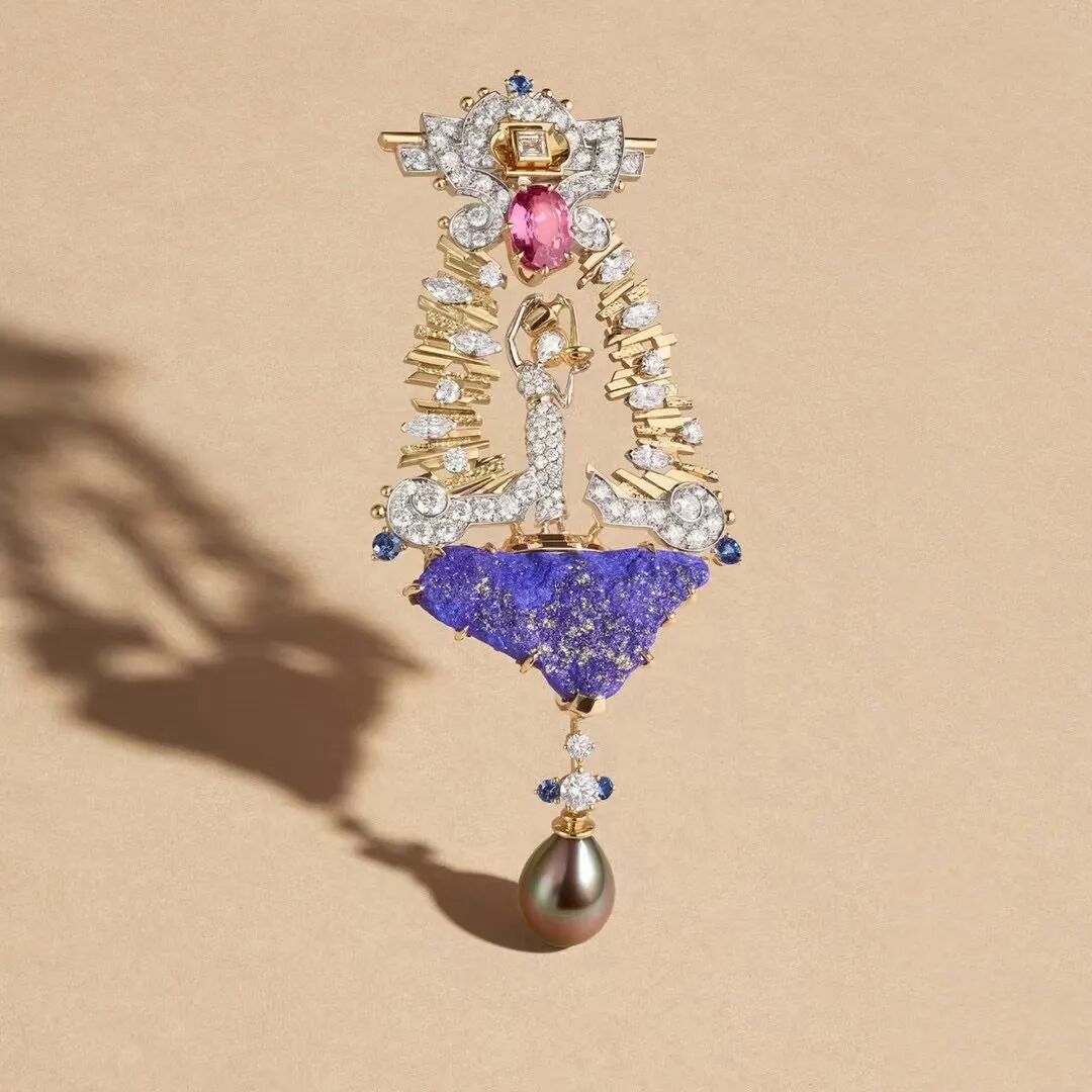 Le Grand Tour这一系列高级珠宝就追寻游学者探访欧洲古代建筑遗迹和文化脉络的步伐,从英国前往法国、阿尔卑斯山脉、意大利和德国等地。“Deaeterna”胸针以英国查茨沃斯庄园里的赫柏(Hebe)女神雕塑为设计灵感,庄园广场的喷泉湖景与古希腊神话中的清纯女神元素相融合,利用粉色蓝宝石和青金石与大溪地珍珠为整件作品增添场景的故事性,三种不同材质的主石碰撞出多元的力量感,显现欧洲古典的建筑与文化之间极具时代性的特征。