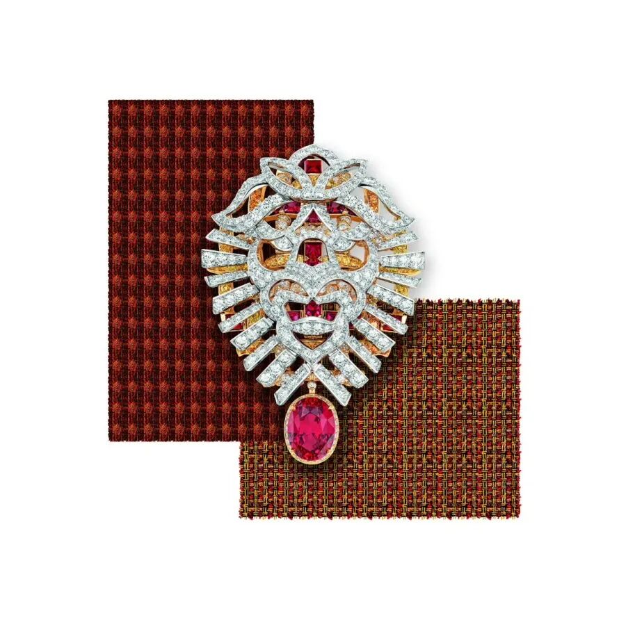 斜纹软呢在香奈儿Tweed de Chanel高级珠宝系列新一季作品中,再次在材质和形式的无限创新中编织令人惊艳的珠宝之美。“Tweed Lion”是这一系列中尤为引人注目的一件,狮子的轮廓和细节包括鬃毛、眼睛、鼻子和嘴巴都呈现立体效果,以庄严而简约的形态屹立于醒目的位置。红宝石规律地排列在金色编织纹理中,色调浓郁、寓意高贵的红宝石为整件强大气场的项链凸显充满力量、勇气的女性主义语言,隐秘的钻石也为金色更添高雅的光芒。