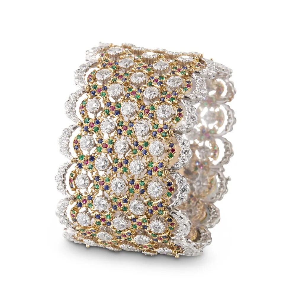 引人注目的一件手镯作品的灵感来自创始人之子Gianmaria Buccellati 1976年创作的马赛克主题手链。镯壁运用品牌标志性Enchaining连接工艺将黄金和白金衔接成镂空铰链结构,通过宝石撞色突出华丽的琉璃砖色彩。