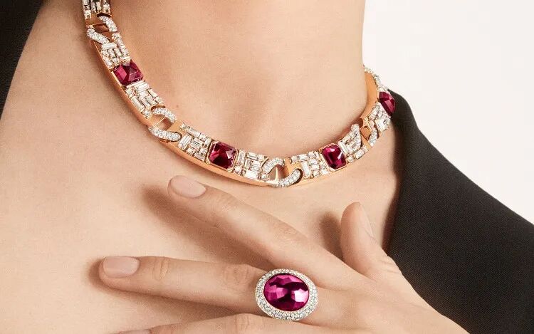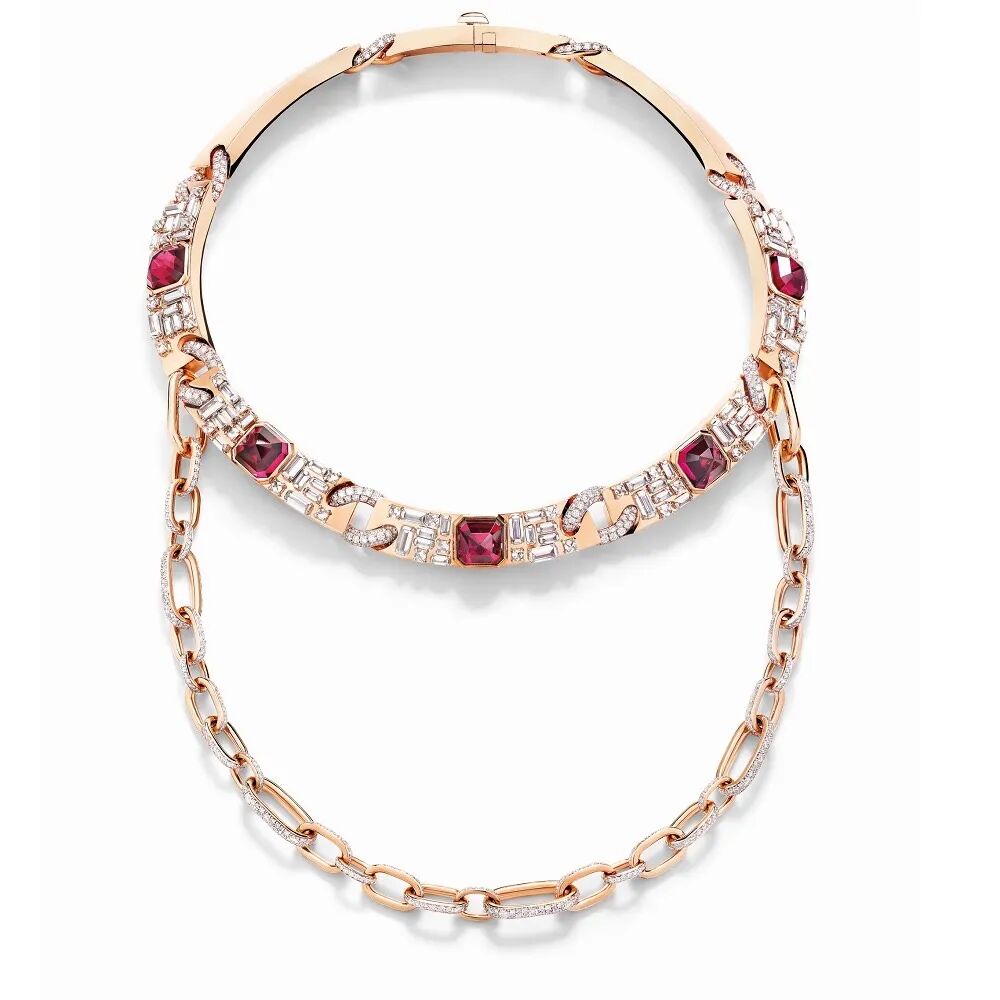 “Contemporary Heritage”主题灵感源于建于14世纪的“斯福尔扎城堡”(Castello Sforzesco)的石砌墙——引人注目的是一件Castello玫瑰金项链,反向镶嵌5颗总重近30克拉红碧玺主石成为焦点,阶梯形和方形切割钻石有如城堡的石砌墙,垂落一条可拆卸的镶钻马鞭链成为点睛之笔。