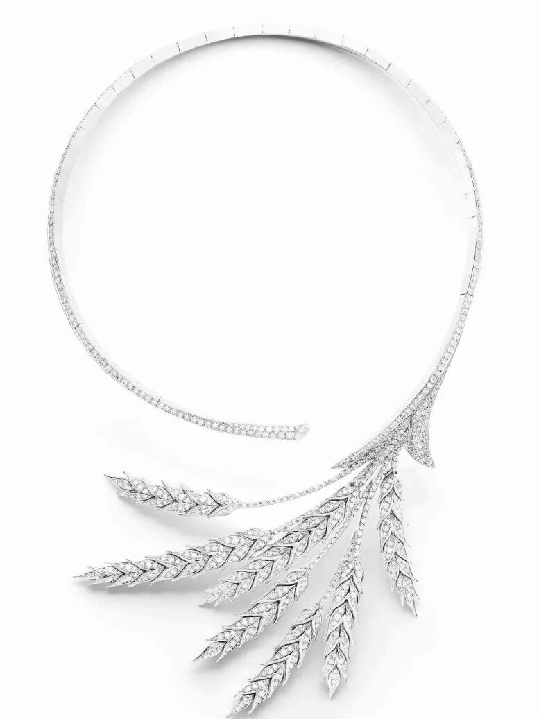 问号项链如同它的名字,整体形似问号,呈现无搭扣、不对性的形制。这一设计灵感起初意在勾勒出女性优美的颈部曲线,在问世之后至今,我们能见到许多设计元素被装饰在问号项链的尾端,有羽毛、常青藤、莲花、麦穗等。