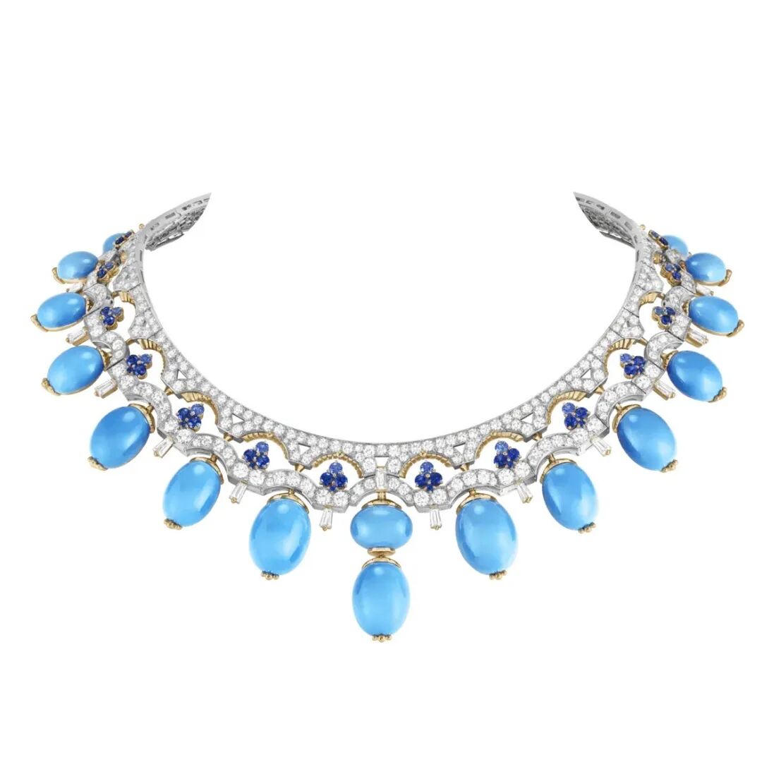 “Chant des gondoliers”项链以色彩鲜艳的16颗椭圆形切割绿松石再现威尼斯湖域的潋滟波光。宝石的顶部密镶钻石,拱形设计与纵横威尼斯水道的桥墩一脉相承,宛如邀人沿河游荡,将思绪带回浪漫水乡。