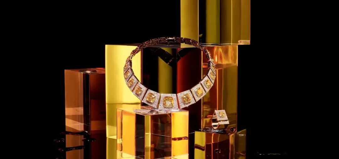 一颗20.04克拉水滴形黄钻和一个9.07克拉枕形无色钻石简洁地立于颈圈之上,抛光的镜面设计与大克拉的钻石形成强烈对比,光影与线条间构成新颖且玩味的自我天性。这件颈圈既在珠宝的构型上大胆使用抽象表现主义,又突破传统的工艺设计,呈现粗犷中透着精致与细腻、饱满的造型中仍有时代语言的活力。