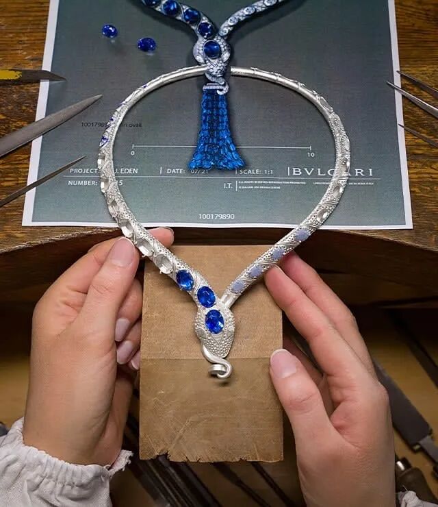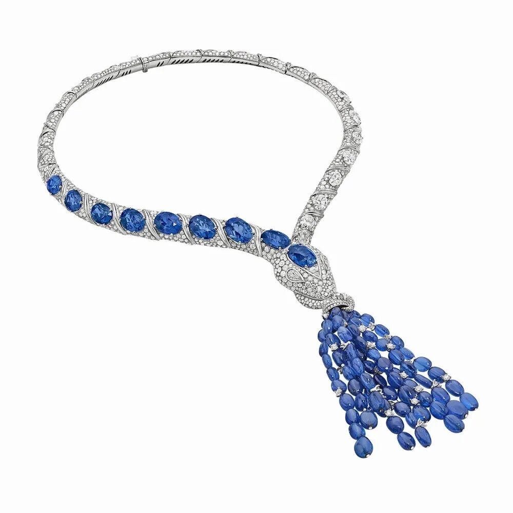 “Mediterranean Sapphire”铂金项链以耗时超过1400小时的巨大制作工程量,展现品牌基因中的“智慧灵蛇”与地中海蓝白相间的建筑之间的巧妙融合。9颗总重为40.81克拉的椭圆形切割赞比亚蓝宝石从灵蛇头顶部向蛇身蔓延镶嵌。