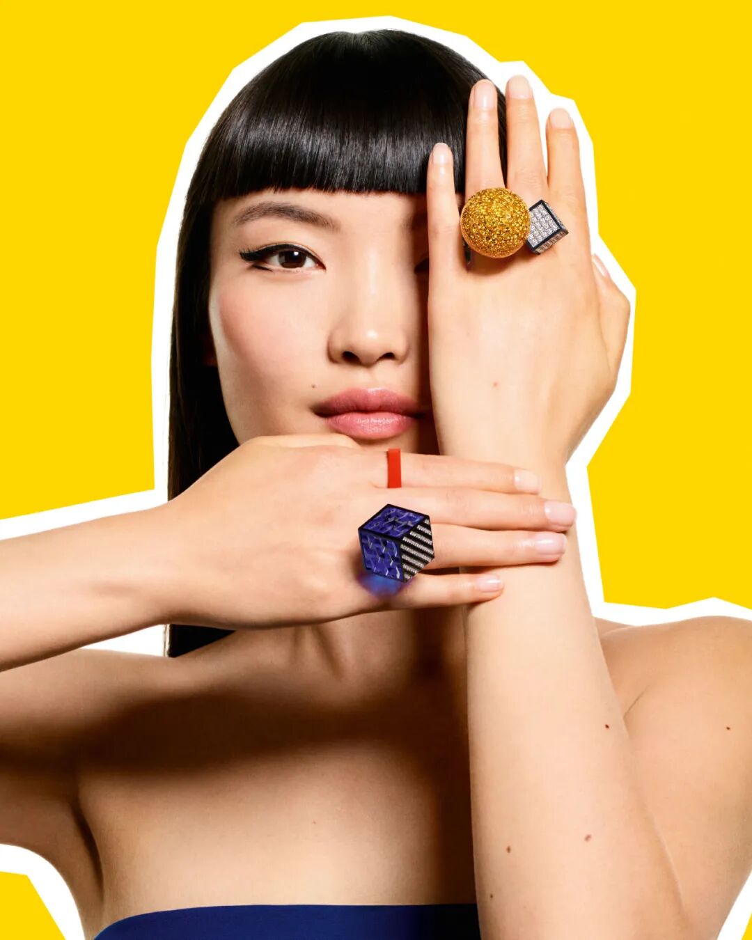 “This is Not a Ring”主题以球体、立方体、条纹等几何造型塑造出6枚戒指,宛如20世纪70年代超现实主义艺术作品——你可以看到一枚树脂制作的双环戒指,水晶球体镶嵌黄钻和黄色蓝宝石彰显精湛工艺。圆球紧挨一个黑色钛金属和钻石打造的立方体,与球体元素相映成趣,彰显谐美的几何趣味。