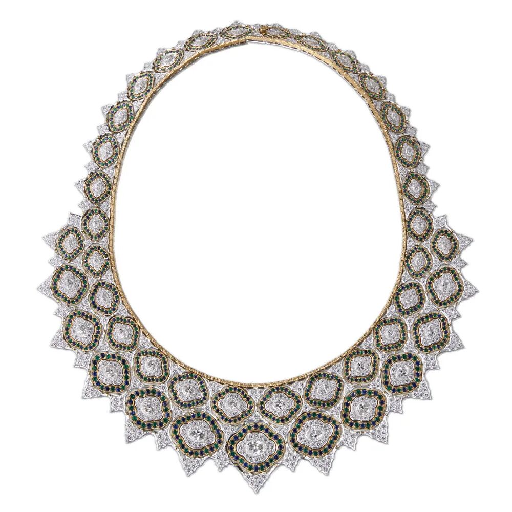 任何一种风格都是一个时代历史背景下的产物,拜占庭以其富饶的地产和发达的贸易成就了当时拥有独特人文风格的“黄金时代”。拜占庭时期尤其盛行镶嵌画,这一艺术风格以有色玻璃碎片拼凑而成,常被运用在拜占庭时期的建筑门窗、穹顶、外墙以及壁画中,呈现为如今我们认识中的马赛克画面。而布契拉提2023新一季高级珠宝Mosaico系列则以这一历史建筑元素为起点,沿用Rigato金雕拉丝工艺、Tulle珠罗纱工艺等复杂手工金匠技艺,搭配瑰丽彩宝和钻石,展现华丽繁复的拜占庭风格。