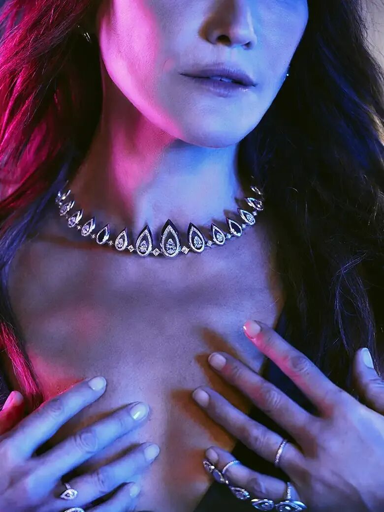 “Ultimate Party”主题高级珠宝中的一件白金颈链尤其引人注目。为致敬20世纪70年代女性自由张扬的生活态度,这件颈链由一片完整的白金箔片手工打造出自然柔和的流线型轮廓,贴合颈部线条的同时也满足我们对于女性主义充满力量的大胆创想。