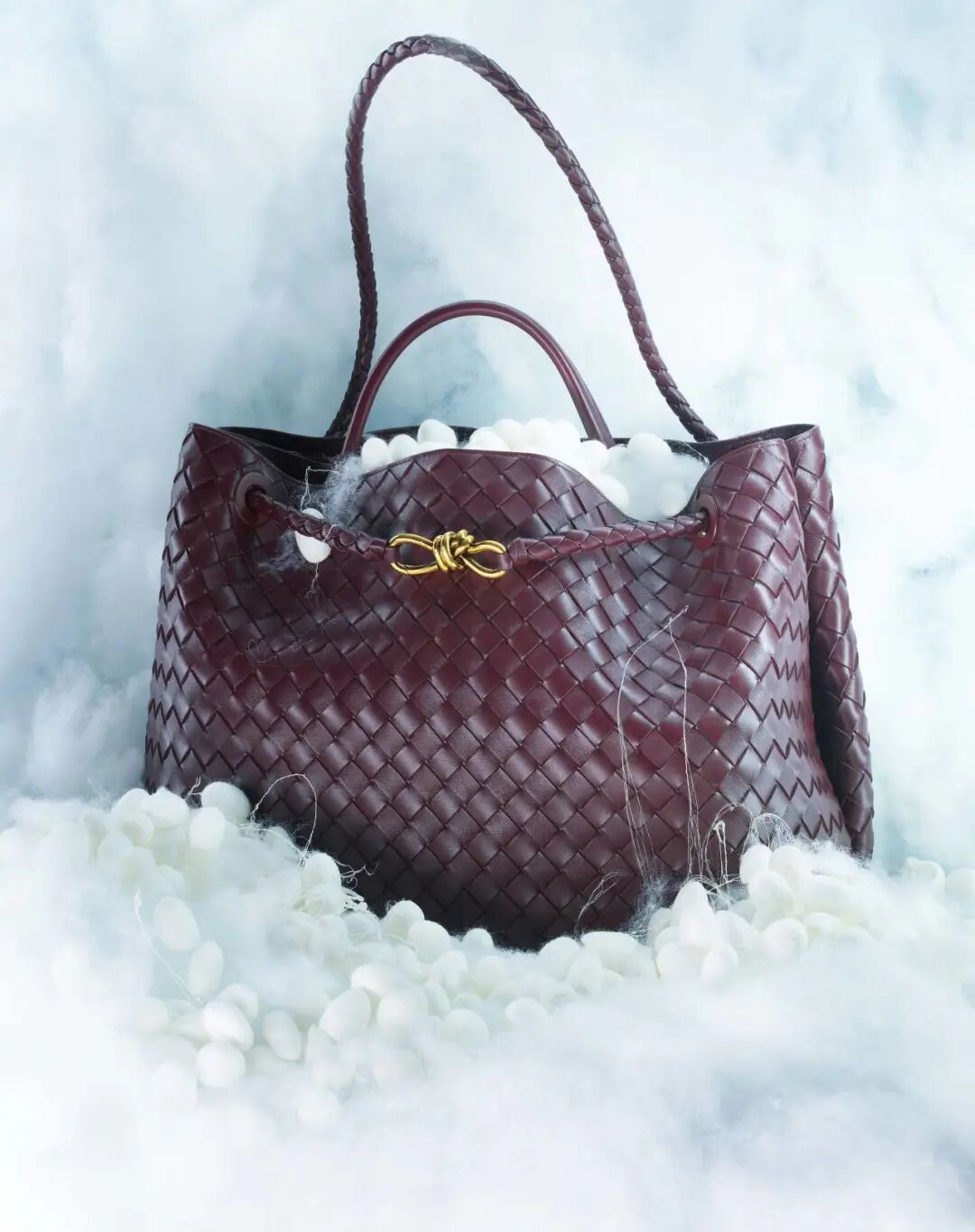 这款手袋的背带同样采用编织工艺,并且在接口处搭配了黄铜绳结装饰,让整个包看起来更有高冷精致的气息。