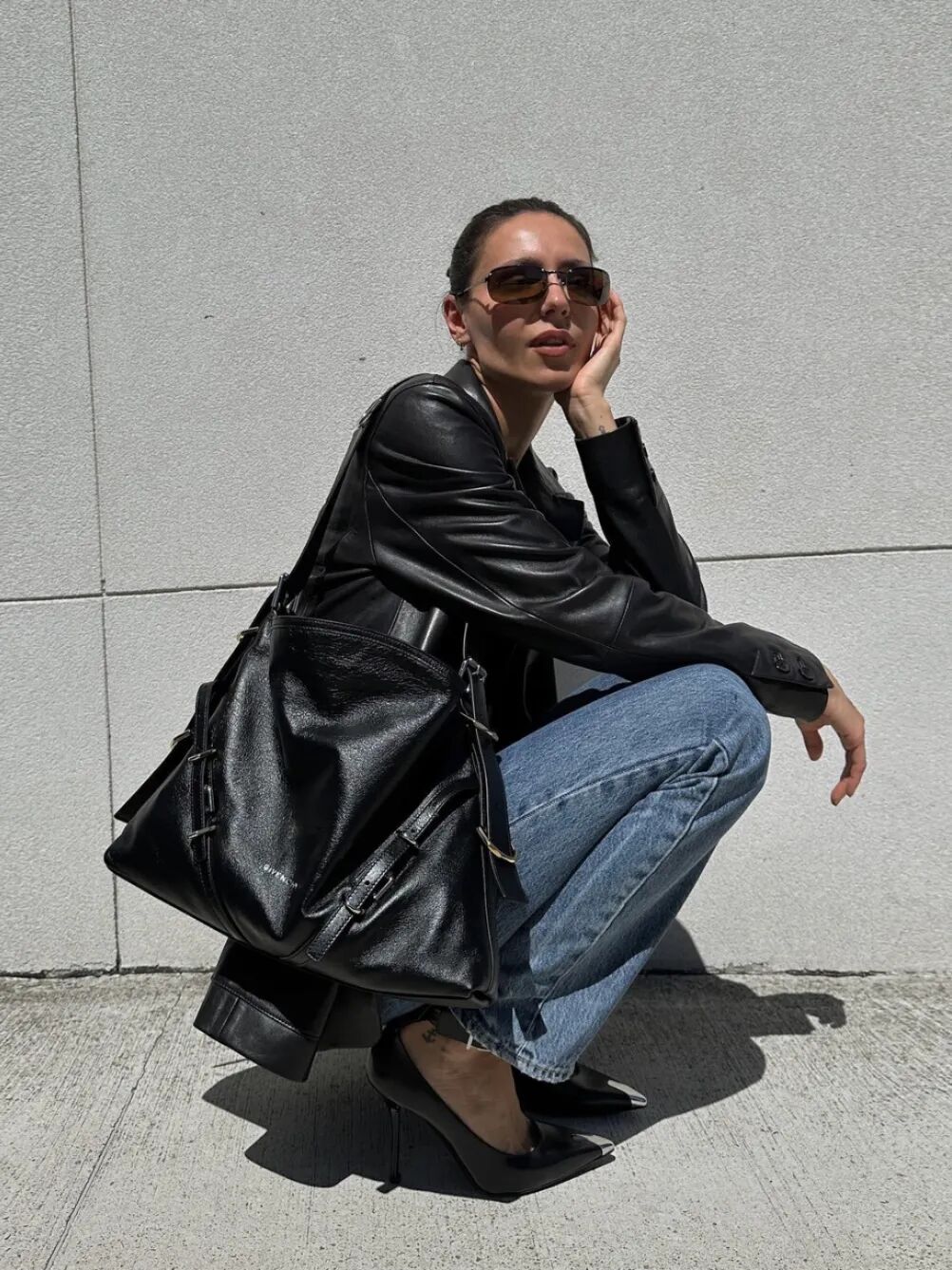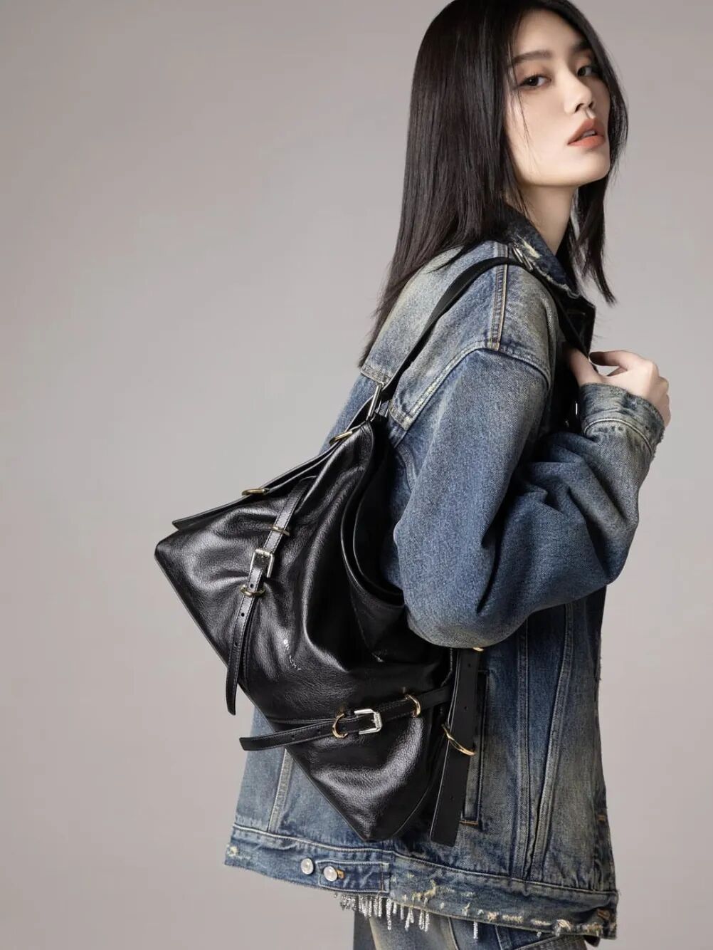 虽然看起来比较难驾驭,但其实这款包背上身的效果比单看包包本身更帅,随便搭配就能背出高冷的酷感,和皮衣、牛仔更是绝配。