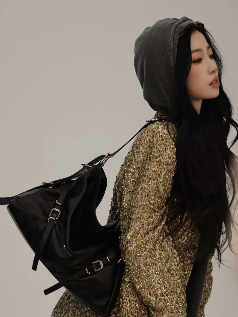自然垂坠的包款,加上金属搭扣和绑带装饰,让这款包自带潇洒不羁的滤镜,是受热捧包袋中少见的带有摇滚风的手袋。