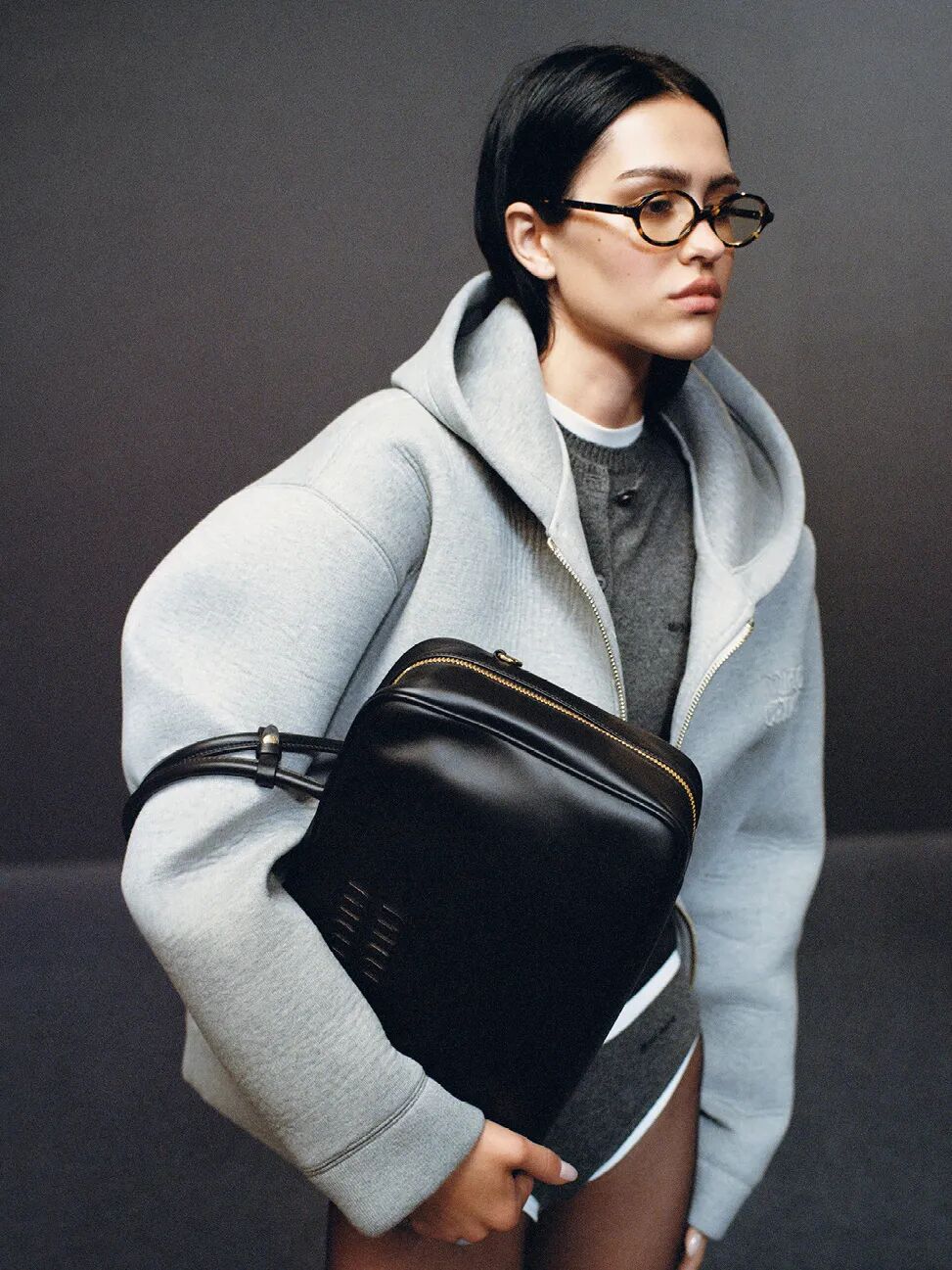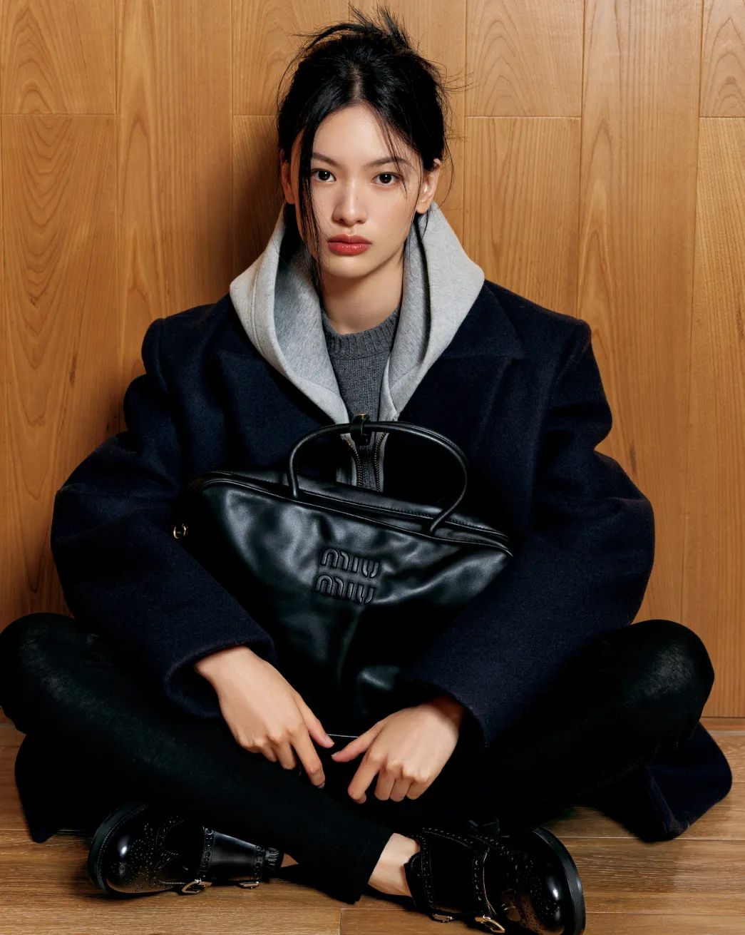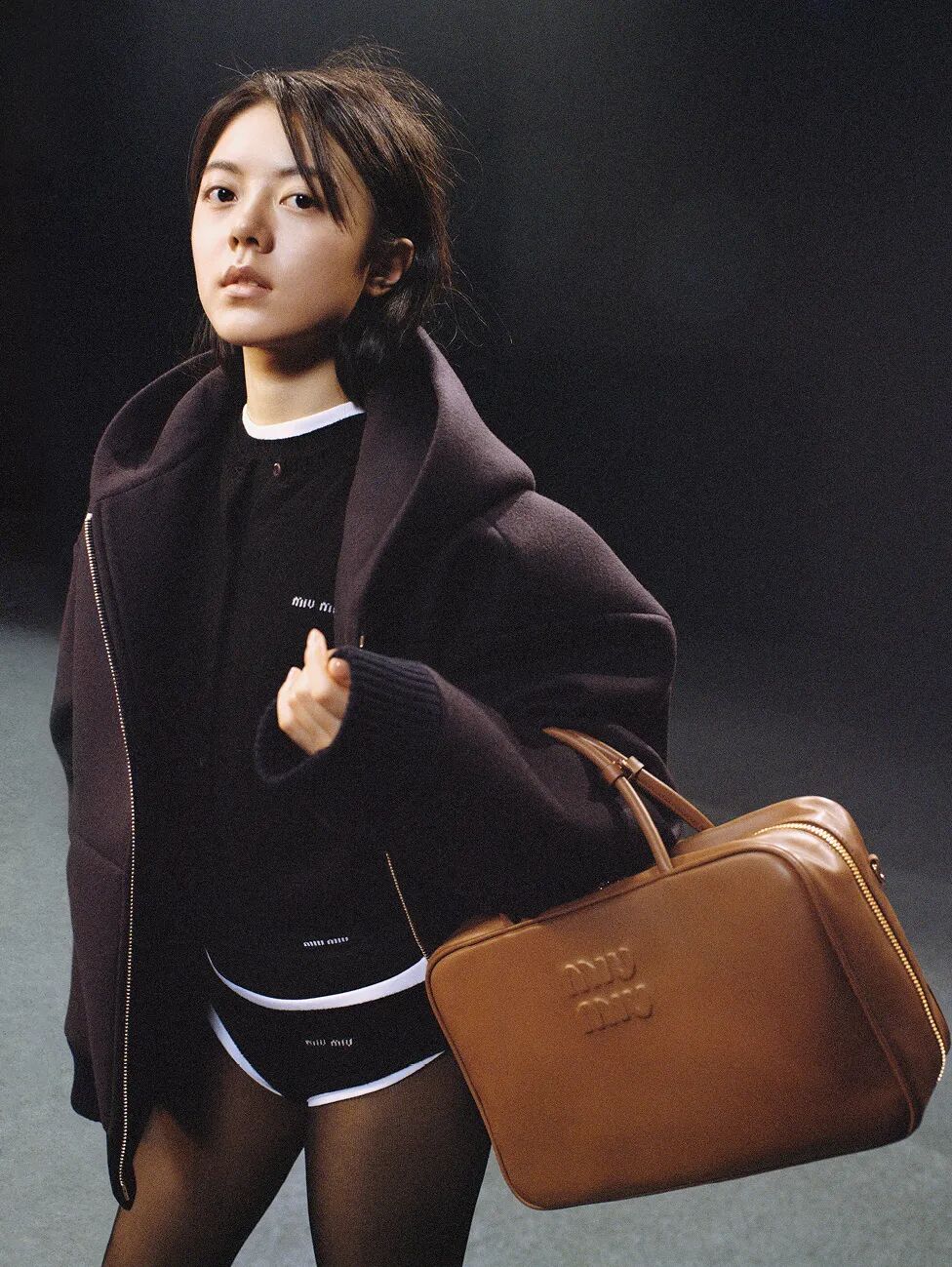 方正的包形、低调的配色加上质感皮革,没有Miu Miu标志性的少女风褶皱元素,仅仅点缀了浮雕logo,整体有种知识分子风的文艺时髦感。